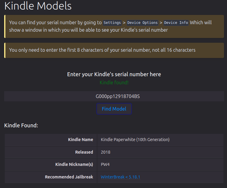 Die Seite ist hervorragend gemacht. Nachdem man den Button „Getting Started With Jailbreaking“ gedrückt hat, wird man aufgefordert, die Seriennummer seines Kindles einzugeben. Danach bekommt der Besucher sofort die zu installierende Version des Jailbreaks genannt. Bei mir stand: Recommended Jailbreak - WinterBreak < 5.18.1 Es folgen nun sieben Seiten, die den Benutzer Schritt für Schritt durch den Vorgang begleiten. Aber keine Angst: