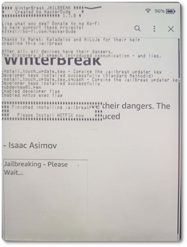 Nach kurzer Zeit erscheint auf dem Kindle das Jailbreak-Logo, das wir antippen. Bei beiden Geräten, die ich mit Jailbreak geflasht habe, dauerte der Vorgang erheblich länger als die angegebenen 30 Sekunden. Nehmen Sie sich also Zeit für einen Kaffee und lassen das Gerät eine halbe Stunde ruhen.