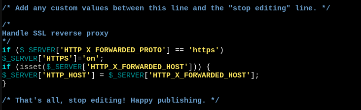 Durch die letztere Konfiguration kann WordPress nun die internen Anfragen von NGINX von http auf https übersetzen und die Seite wird korrekt dargestellt, da die mitgelieferte .htaccess Datei von WordPress dies nicht tut.