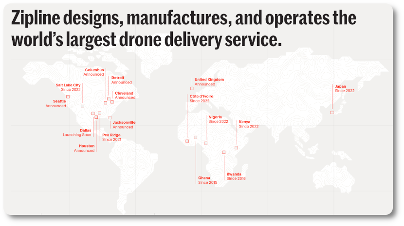 Eine Karte auf der Website von Zipline zeigt die Standorte, an denen die Geräte getestet wurden.