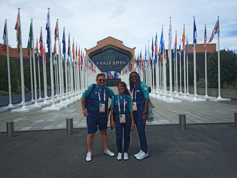 Trotzdem passe ich in den Sportanzug rein, ohne mich zwängen zu müssen. Schön finde ich ihn auch jetzt noch nicht, und in dem Zug nach Paris fühle ich mich auch ein wenig unwohl. Die Olympischen Spiele werden in Paris mit gemischten Gefühlen aufgenommen und ich fürchte, zu viel Aufmerksamkeit oder gar Beschimpfungen ausgesetzt zu sein. Sie bleiben aber unbegründet, denn sowohl im Zug als auch in der Metro werde ich weitestgehend ignoriert und gehe in den Menschenmassen unter. Ärger bereitet mir nur mein Ticket, da die Schranke der Metro sich mir partout nicht öffnen will. Gestresst laufe ich durch die Halle vom Gare de Lyon und werde von A nach B geschickt, bis sich endlich jemand erbarmt und ein kostenloses Ticket ausdruckt, welches mir den Einlass ermöglicht. In der Metro spreche ich eine Dame an, die auch eine Uniform wie ich trägt. Eine Französin namens Beatrix aus Guadaloupe. Sie erzählt mir, dass sie für Marokko eingeteilt sei, und ich bin etwas verwirrt, denn mir ist meine Nation, für die ich beschäftigt sein soll, nicht bekannt. Anhand meiner Nummer und einer Tabelle, die sie Tags zuvor, wie fast alle anderen NOC-Assistenten, erhielt, ermittelt sie mein Team. Bahamas. Ich nicke freundlich und gehe davon aus, dass sie sich vertan haben muss, da Bahamas zu abwegig klingt. In Saint-Denis-Pleyel steigen wir aus und finden uns in einer riesigen, aber menschenleeren Metrostation wieder. Eine weitere Dame schließt sich uns an, sie heißt Sabrina und kommt aus Turin. Gemeinsam folgen wir Beatrix, die sich auch nicht auskennt, aber Google Maps bereits angeworfen hat und uns zum Eingang des Dorfes navigiert. Wir werden wie am Flughafen durchsucht, was aber reibungslos vonstatten geht, und gehen gemeinsam zum Cité du Cinéma. Diesmal können wir uns nicht verlaufen, denn an jeder Ecke steht eine Person, die uns die Richtung weist. Vor dem Haupteingang der Cité du Cinéma, deren Eingang mit den Flaggen der teilnehmenden Nationen geschmückt ist, dürfen wir ein Foto machen. Es ist einer der seltenen Momente, in denen uns dies gestattet sein wird.